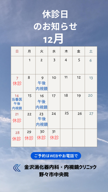 検査日として完全予約制で開院いたします。午前中は当番医となっており、内視鏡検査は行いませんのでご注意ください。
