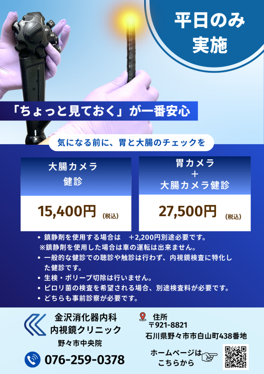 3月まで、平日限定で特別価格での大腸カメラ健診を実施しています。「特に症状はないけれど、一度大腸カメラを受けて大腸をチェックしたい。」とお考えの方にピッタリです。